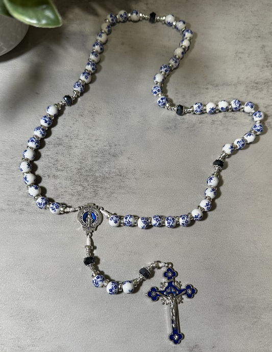 Catholic Rosary Beads | White Ceramic Blue Flower, Crystal Glass | Immaculate Conception Inspired